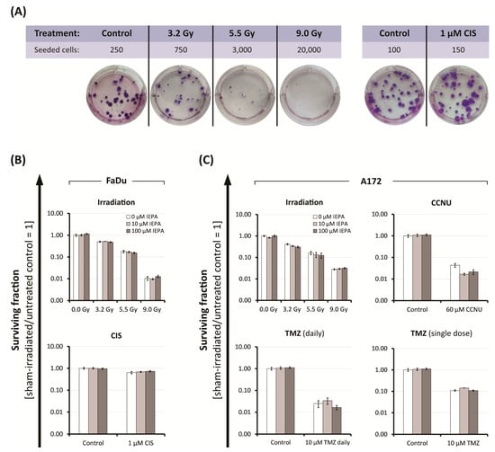To examine the long-term effects of IEPA combined with IR (single-dose: 3.2–9.0 Gy) or chemotherapeutic treatment (FaDu: 1 µM CIS; A172: 60 µM CCNU, 10 µM TMZ daily and single-dose) on the clonogenic survival of tumor cells, we performed clonogenic assays. After IR, a dose-dependent reduction of the surviving fractions to 1.1 × 10−2 ± 2.1 × 10−3 (FaDu) and 2.8 × 10−2 ± 1.9 × 10−3 (A172) at 9 Gy was observed (Figure 4B,C). The tested cytostatic agents decreased the surviving fractions to 6.4 × 10−1 ± 7.5 × 10−2 (CIS), 4.4 × 10−2 ± 9.1 × 10−3 (CCNU), 2.5 × 10−2 ± 8.8 × 10−3 (TMZ daily, 4 fractions), and 1.1 × 10−1 ± 8.9 × 10−3 (TMZ, single-dose). IEPA alone and in combination showed no protective effect on the long-term survival of clonogenic tumor cells. In A172 cells treated with CCNU and TMZ (daily), 100 µM IEPA seemed to further decrease the clonogenic survival.