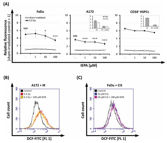 (A) Effect of IEPA (1, 10, 100 µM) after IR (5.5 Gy) on intracellular ROS levels indicated by DCF fluorescence in FaDu and A172 cells (mean ± SEM of three experiments in triplicates or quadruplicates) as well as CD34+ HSPCs (mean ± SEM of one experiment in duplicates). Statistical significance obtained from analysis of variance (ANOVA) and Gabriel post hoc test displayed as asterisks (***) compared with irradiated control and as hashes (###) compared with sham-irradiated control. Inserts depict corresponding inhibition controls with 5 mM ß-mercaptoethanol (β-ME). *, p ≤ 0.05. Flow-cytometric histograms of IEPA (100 µM) effects compared with untreated control on intracellular ROS 48 h after (B) IR (5.5 Gy) on A172 cells, or (C) CIS (20 µM) on FaDu cells.