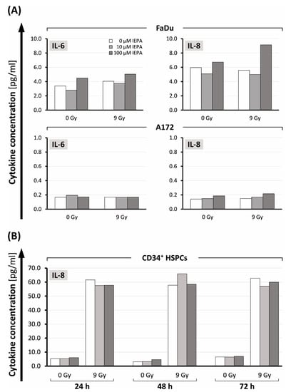 (A) IL-6 and IL-8 release 24 h after treatment with IEPA (10, 100 µM) as well as IR (9 Gy) in FaDu cells and A172 cells. (B) IL-8 levels in CD34+ HSCPs 24, 48, 72 h after IEPA application (10, 100 µM) and IR (9 Gy). All analyte concentrations obtained using flow-cytometric bead array (CBA) in one experiment with single measurements.