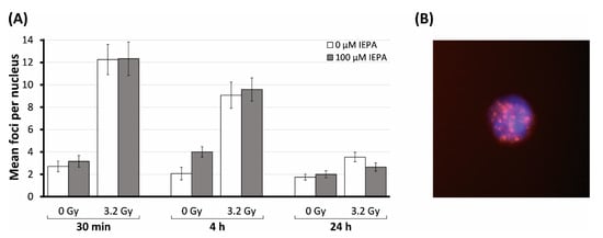 IR (3.2 Gy) induced an increase in γH2AX foci per nucleus from 2.7 ± 0.5 in the sham-irradiated control to 12.3 ± 1.4 after 0.5 h (Figure 8A). Time-dependent decreases in IR-induced foci to initial levels were observed at 4 h (9.1 ± 1.2) and at 24 h (3.5 ± 0.4), indicating DSB repair. IEPA showed no effect in preventing the initial formation of DSBs and did not affect the repair process of DNA damage.