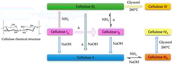 Cellulose can also be classified according to its crystalline structure as cellulose I, II, III, and IV (Figure 1). Cellulose I, or native cellulose, is the most abundant form in plant cell walls. We can find it in two distinct allomorphs: Iα consisting of a triclinic unit cell, and Iβ of a monoclinic unit cell. Cellulose produced by bacteria and algae is enriched in Iα, while cellulose in cotton, wood, and ramie fibers is predominantly Iβ [8,9,10]. The mercerized (alkali-treated) process can convert cellulose I into cellulose II. Cellulose III is prepared by treating native cellulose and cellulose II with anhydrous ethylamine or liquid ammonia and can be further converted into cellulose IV by glycerol treatments at high temperatures [11].