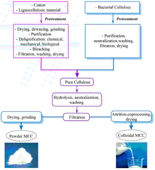 Nowadays, MCC is produced mainly from wood and cotton since they are the most abundant industrial sources of cellulose [38,39,40]. However, wood and cotton are only available in some areas. Competition between fields, such as paper industries, buildings, and furniture, makes these two sources only partially serviceable for cellulose and MCC production. Thus, interest in other sources, such as grass, aquatic and terrestrial plants, and agricultural wastes, has recently increased.
