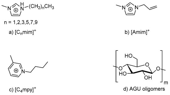 Zhao et al. applied molecular dynamics simulation to study cellulose dissolution in the ILs with the same anion (Cl−), but different cations. The ILs used include 1-alkyl-3-methyl imidazolium ILs [Cnmim]Cl (n = 2, 3, 4, 6, 8, 10), 1-butyl-3-methyl pyridinium chloride [C4mpy]Cl and 1-allyl-3-methyl imidazolium chloride [Amim]Cl. The structures for these ILs are shown in Figure 3 [73].