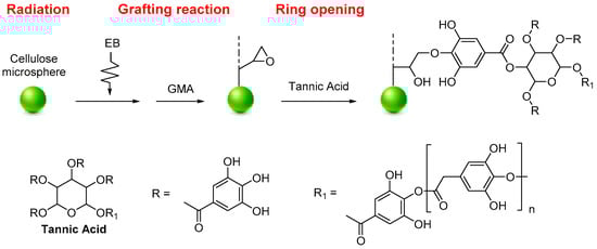 Tannic acid (TA) functionalized MCC was used for the selective recovery of gallium (Ga) and indium (In), as reported by Du et al. The functionalization was performed by radiation-induced grafting polymerization. The selective separation and recovery of Ga (III) and In (III) from potential leaching solutions were investigated using batch and fix-bed column experiments. Firstly, a radiation grafting technique prepared glycidyl methacrylate-grafted cellulose (MCC-g-GMA). The MCC-g-GMA was added to a TA aqueous solution to obtain the MCC-g-GMA-TA system (Figure 5). The functionalized MCC can recover Ga (III) from the simulated semiconductor waste-leaching solution containing As (III), Cu (II), Zn (II), and Ni (II) with a maximum adsorption capacity of 26.55 mg·g−1. On the other hand, In (III) can be separated from simulated Zn refinery residue leaching solution containing Cu (II), Zn (II), and Ni (II) with a maximum adsorption capacity of 35.63 mg·g−1. The FTIR, XPS analyses, and the ionic strength effect revealed that functionalized MCC can selectively recover gallium and indium by forming chelates between the hydroxyl groups and Ga+3 or In+2 [86].
