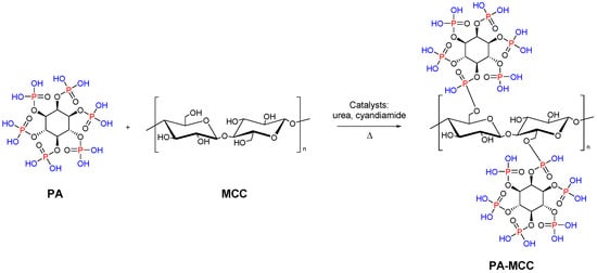 Functionalized microcrystalline cellulose can be also used as a flame retardant. In particular, Yuan et al. reported the chemical modification of MCC with phytic acid (PA) by phosphorylation reaction for enhanced flame-retardant ability. The modified microcrystalline cellulose was synthesized at 90 °C with a 1:3 weight ratio of MCC to PA (Figure 8). The resulting system showed low heat release performance and good char-forming ability during thermal degradation. This work reveals that the PA phosphorylated MCC can act as a promising flame-retardant material [89].