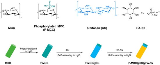 Finally, Lou et al. studied and synthesized a fully bio-based flame retardant with high efficiencies and mechanical reinforcement functions for epoxy resin. Microcrystalline cellulose was surface functionalized with chitosan (CS) and sodium phytate (PA-Na) via layer-by-layer assembly in water (Figure 9). The functionalized MCC catalyzes the degradation of epoxy resin to produce char residues with the formation of stable phosphate and nitride species in the condensed phase. The char can act as a physical barrier to inhibit smoke production and heat transfer. This result shows that the total heat release, total smoke production, peak heat release rate, fire growth rate, peak smoke production release, and fire retardancy index of the epoxy composites are greatly reduced, confirming their good fire-retardant ability. Moreover, adding 15 wt.% of modified microcrystalline cellulose can simultaneously enhance the composites’ strength, modulus, and toughness due to the satisfactory interfacial compatibility, favorable dispersion, and mechanical reinforcement effect of MCC [90].