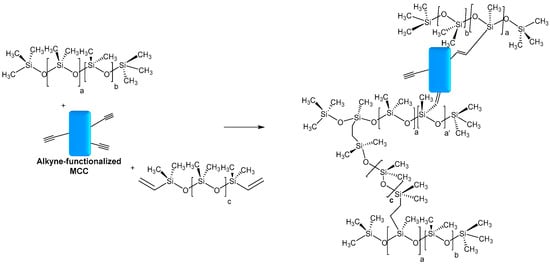 Possible hydrosilylation reaction occurring between alkyne-functionalized MCC and hydride-functional PDMS.