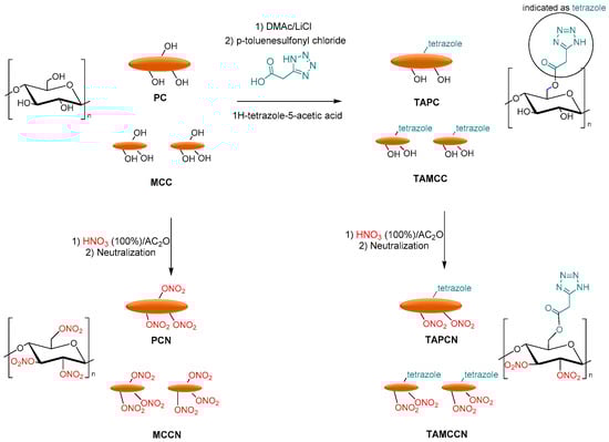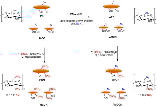 Tarchoun et al. reported the azide-modification of microcrystalline and pristine cellulose as promising nitrogen-rich energetic biopolymers. Azidodeoxy-microcrystalline cellulose nitrate (AMCCN) and azidodeoxypristine cellulose nitrate (APCN) were synthesized, and their properties were compared to cellulose nitrate (PCN) and microcrystalline cellulose nitrate (MCCN). PC and MCC were dissolved in DMAc/LiCl, and p-toluenesulfonyl chloride (hydroxyl activating agent), triethylamine (base catalyst), and subsequently sodium azide was added to obtain the corresponding azidodeoxy-pristine cellulose (APC) and azidodeoxy-microcrystalline cellulose (AMCC). Finally, the nitration of free-accessible hydroxyl groups of chemically functionalized and non-functionalized samples was performed with a mixture of fuming nitric acid and acetic anhydride to afford the corresponding PCN, MCCN, APCN, and AMCCN (Figure 12).