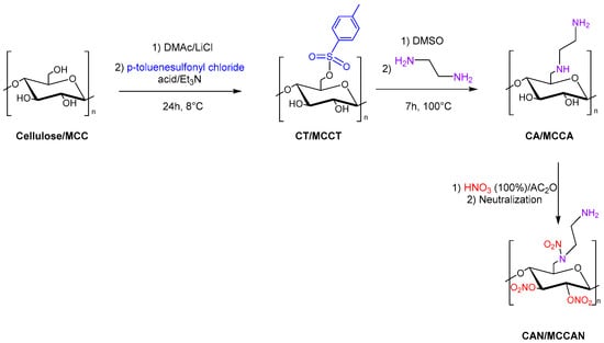 Tarchoun et al. also studied 6-deoxy-6-(ω-aminoethyl)nitramino microcrystalline cellulose nitrate (also referred to as microcrystalline cellulose amine nitrate, MCCAN) and 6-deoxy-6-(ω-aminoethyl)nitramino cellulose nitrate (also referred to as cellulose amine nitrate, CAN) as a new class of insensitive energetic nitrogen-rich polymers through chemical modification of cellulose and microcrystalline cellulose (MCC). Cellulose and MCC were dissolved in DMAc/LiCl, and p-toluenesulfonyl chloride with triethylamine was added to obtain cellulose tosylate (CT) and microcrystalline cellulose tosylate (MCCT). Then, the displacement of tosyl groups with ethylenediamine moieties was carried out in DMSO. Finally, 6-deoxy-6-(ω-aminoethyl)nitramino cellulose nitrate (CAN) and 6-deoxy-6-(ω-aminoethyl)nitramino microcrystalline cellulose nitrate (MCCAN) were synthesized with a mixture of fuming nitric acid and acetic anhydride (Figure 13).