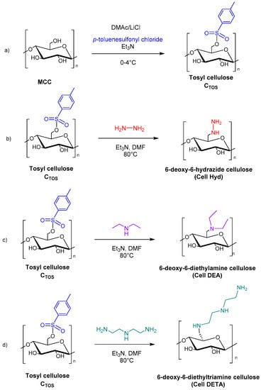 After MCC’s production and isolation, chemical derivatization can convert it into functional materials. However, its crystalline structure, composed of cellulose molecular chains arranged in an orderly manner through hydrogen bonding, makes microcrystalline cellulose less accessible to functionalization [48]. In order to enhance its reactivity, in recent years, attention has been driven to its activation.