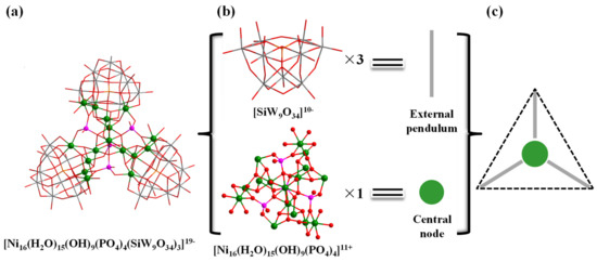 Combined wireframe/ball-and-stick representation of Ni16P4(SiW9)3: (a) [Ni16(H2O)15(OH)9(PO4)4(SiW9O34)3]19-; (b) Representations of the building blocks of Ni16P4(SiW9)3; and (c) Triangular geometry of Ni16P4(SiW9)3. Color code: W grey, Ni green, P pink, Si orange, O red.