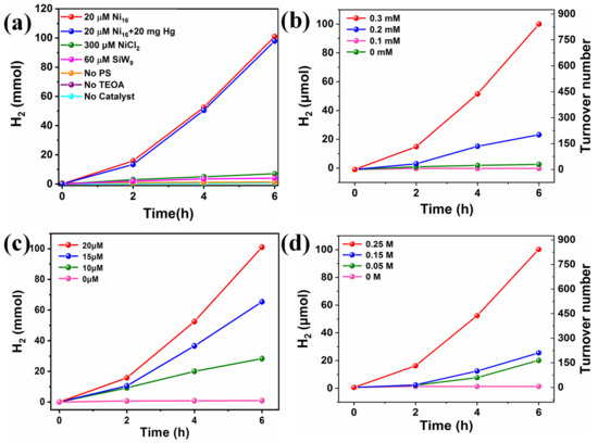 (a) photocatalytic H2 evolution using different catalysts and control experiments and varying concentrations of, (b) [Ir(coumarin)2(dtbbpy)]+ photosensitizer, (c) TBA-Ni16P4(SiW9)3 catalyst, and (d) TEOA sacrificial agent. Standard reaction conditions: 300 W Xe lamp with a 400 nm cutoff filter, [Ir(coumarin)2(dtbbpy)]+ (0.3 mM), TEOA (0.25 M), H2O (2 M), catalyst (20 μM), CH3CN/DMF (v/v = 1/3) deaerated with Ar/CH4 (v/v = 4/1).
