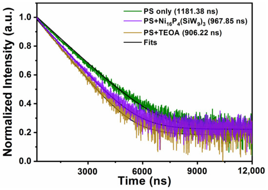 By using the time-resolved fluorescence spectroscopy, the decay kinetics of the excited state [Ir(coumarin)2(dtbbpy)]+* was also investigated. The experimental phenomenon that both TBA-Ni16P4(SiW9)3 and TEOA can accelerate the decay of [Ir(coumarin)2(dtbbpy)]+* luminescence was obvious (Figure 5). The single-exponential fitting of decay kinetics of [Ir(coumarin)2(dtbbpy)]+* yielded a lifetime of ~1181.38 ns, which was further decreased to ~906.22 and ~967.85 ns in the presence of TEOA and TBA-Ni16P4(SiW9)3, respectively. These results clearly revealed that both reductive and oxidative quenching processes existed during photocatalysis and the reductive quenching process is the dominant one, thus agreeing with the steady-state emission quenching results.