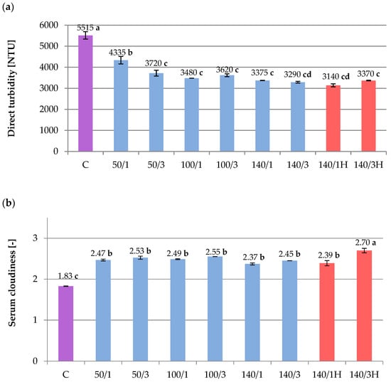 Influence of HPH processing on beetroot juice parameters: (a) Direct turbidity (NTU). (b) Serum cloudiness (absorbance at 660 nm). C—control; 50/1, 50/3, etc.,—pressure/number of cycles; H—samples without cooling. The values with different letters are significantly different (p < 0.05).