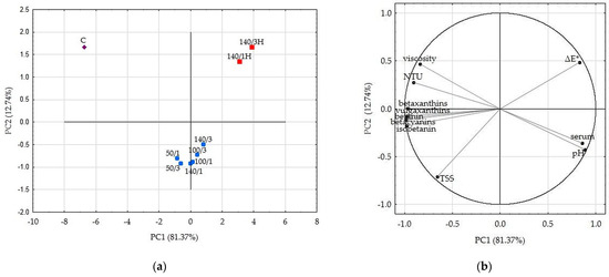 Principal component analysis (PCA) figures, based on the first two principal components which explained 94.11% of the total variance, demonstrate grouping of the beetroot juice samples according to parameters of HPH treatment (Figure 2a,b).