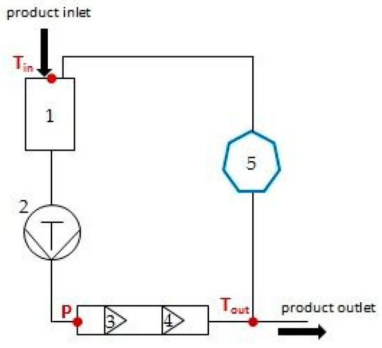 Schematic diagram of the high-pressure homogenizer used in the study. 1—feeding hopper, 2—piston pump, 3—first stage valve, 4—second stage valve, 5—intermediate container with cooling capability; Tin—inlet temperature measured at the feeding hopper, P—summary pressure of first and second stage valves measured by digital manometer, Tout—outlet temperature measured after leaving the head with the valves.