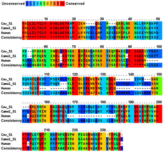 Multiple sequence alignment of cow milk caseins (αS1- variant B, αS2- variant A, β-variant A1, and κ-variant A) and those of the major camel, human, and elephant caseins, and indication of conserved and unconserved amino acid residues. The amino acid sequences are retrieved from UniProt/NCBI database, and the comparison of protein sequences was performed using PRALINE server (https://www.ibi.vu.nl/programs/pralinewww/, accessed on 13 June 2022) to localize the conserved sequence segments. As the selected sequences may show homoplasy, a low E-value inclusion threshold of 0.001 is used to build the alignment through 10 iterative position specific PSI-BLAST iterations. Amino acid residues: alanine (A), asparagine (N), aspartic acid (D), cysteine (C), glutamic acid (E), phenylalanine (F), glycine (G), histidine (H), isoleucine (I), lysine (K), leucine (L), methionine (M), proline (P), glutamine (Q), arginine (R), serine (S), threonine (T), valine (V), tryptophan (W), and tyrosine (Y) [34]. The amino acid sequences of the signal peptides of the different proteins are shown in Table 3.