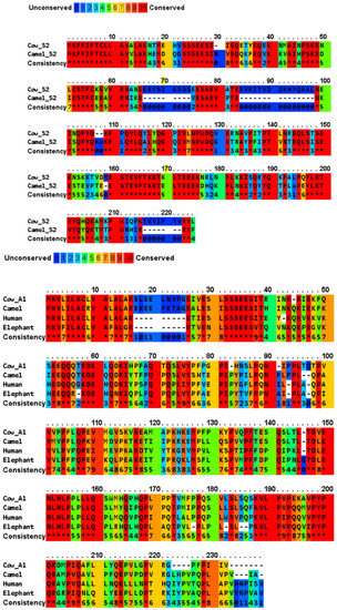 A multiple sequence alignment of four major casein variants (αS1-, αS2-, β- and κ-) has been shown in Figure 2 for the milks of four mammals (cow, camel, human, and African elephant). The four caseins show diverse sequence similarity within the dataset, while their signal peptides share a significantly high sequence similarity (Table 2). In generally, bovine αS1-, αS2-, β-, and κ-caseins showed the lowest similarity to those of the other species. The average sequence similarity and standard deviation of the sequence similarity within the αS1-, β- and κ-casein sets were 45.9 ± 5.5, 59.9 ± 4.5, and 56.2 ± 4.0, respectively. Moreover, human β-casein was more evolutionarily conserved with an average sequence identity of 60.526 compared to the other three functional homologues. PRALINE analysis revealed a strong conservation of the casein sequences across the four evolutionarily distant organisms (Figure 2). To effectively assess the level of such functionally conserved residues, the positions with a conservation score of at least 7 of 10 were considered. The αS1-, αS2-, β- and κ-casein sequences had conservation scores of 7, 8, 9 and 10, respectively, with the following number of conserved residues in the species: αS1-casein with 17, 2, 18, and 19 conserved residues in bovine, camel, human, and African elephant milks, respectively; αS2-casein with 4, 1, 12, and 3 conserved residues in bovine, camel, human, and African elephant milks, respectively; β-casein with 1, 0, 6, and 4 conserved residues in bovine, camel, human, and African elephant milks, respectively; and κ-casein with 59, 126, 87, and 60 conserved residues in bovine, camel, human, and African elephant milks, respectively. As nature tends to pack the function into the smallest possible protein sequence length to conserve energy and resources, the bovine, camel, human, and elephant proteins, encoding 185, 193, 223, and 181 amino acids, respectively, are considered to normalize the conservation across the constructed alignments, which implies that 81 (43.8%), 129 (66.8%), 123 (55.1%), and 86 (47.5%) of the amino acids, respectively, play a crucial role in the functionally of casein molecules.