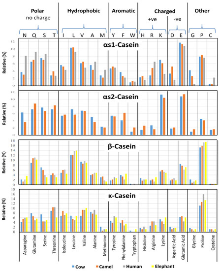 A similarity trend for the uncharged polar, hydrophobic, aromatic, hydrophilic polar, and three other encoded residues across the compared proteins is shown in Figure 3. The functionally crucial residues are likely to be conserved across certain specific positions (Figure 2). As sequence similarity may be due to natively encoded signature patterns across these sequences, and because these proteins have not been experimentally resolved thus far, it is important to decipher the key segments that affect milk quality with reference to nutritional value and processing potentials. The isoelectric point (pI) of proteins is the pH value corresponding to net charge of zero over the whole protein. Because caseins are natively unfolded proteins, their theoretical pI values can be computed from the amino acid sequences and their pKa values using the Henderson–Hasselbalch equation [46]. The studied caseins differ considerably in their pIs, which vary from 4.98 for bovine αS1-casein to >8.5 for bovine αS2-casein and all κ-caseins, except bovine κ-casein. Thus, most of the caseins are moderately acidic, except αS2-casein of bovine and κ-caseins of camel, human, and African elephant. The pI values are useful for analyzing the charge stability of the molecules [47].