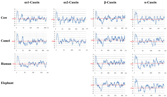Scoring variation of the hydropathy index for the αs1-, αs2-, β-, and k-caseins of the milks of cow, camel, human, and elephant calculated with a default window size of 9 amino acid residues on the basis of the [51] parameters through Pepinfomodule of EMBOSS [52].