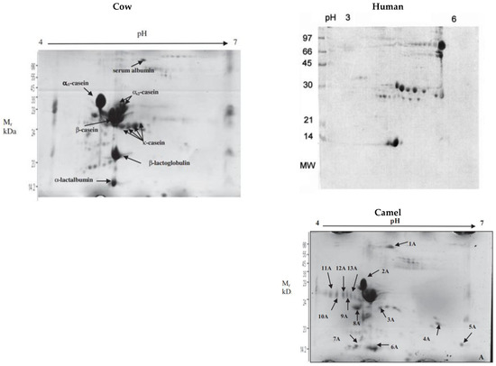 Two-dimensional gel electropherograms showing the different caseins in cow, human, and camel milks. For camel milk: spots 2A and 8A (aS1-casein), spots 3A, 4A, 5A, and 7A (b-casein), and spots 9A, 10A, 11A, 12A, and 13A (k-casein). Source: [65] eproduced with Creative Commons permission.