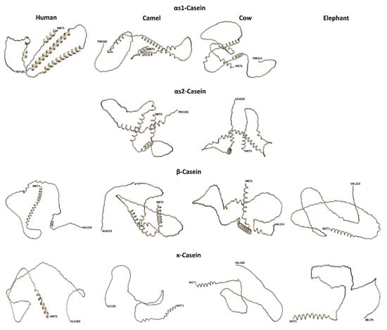 A two-dimensional structure prediction for the milk caseins of bovines, camels, humans, and African elephants is shown in Figure 6. Milk caseins have been described as rheomorphic (from the Greek rheos meaning stream and morphe meaning form) and are known as “random coil proteins” having less ordered secondary structures and no tertiary structures [75] In general, caseins are characterized by low levels of α-helices in comparison to typical globular proteins. Table 4 shows that all caseins exhibit intrinsic distortedness, which occurs more in αS1- and αS2-caseins than in β- and κ-caseins [76]. Bovine αS-caseins have been reported to have higher predominance of α-helices located close to the sites of phosphorylation. The C-terminal of β-casein and the N-terminal of κ-casein encode high proportions of hydrophobic residues, which limit the formation of α-helices and β-sheets. The high proline content in β-casein is responsible for the formation of long hinges in this casein, which impart surfactant properties to this protein. The possible contribution of proline and glutamine to the secondary structural conformations of αS1-, β-, and κ-caseins has been suggested.