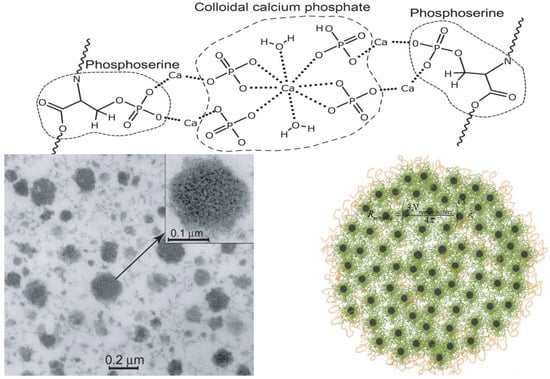 Postulated structure of casein micelle inter-casein linkages of phosphoserine residues to colloidal calcium phosphate. Sources: [5,82]. Reproduced with permission from Elsevier.