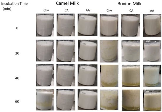 Photographed images of coagulation behaviors with time (0–60 min). Chy (chymosin), CA (citric acid), AA (acetic acid). Source: [104] Reproduced with permission from Elsevier.