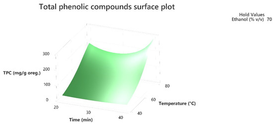 Three-dimensional response surface plot of the TPC (response variable) in mg of gallic acid equivalent/g of dry matter (DM) of oregano as a function of Time (X2) in min. and Temperature (X1) in Celsius degrees (°C) while holding ethanol at 70% (v/v).