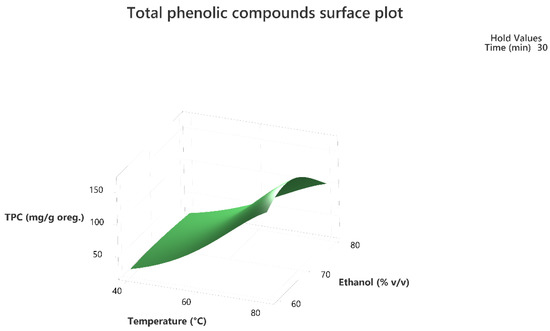 Three-dimensional response surface plot of the TPC (response variable) in mg of gallic acid equivalent/g of dry matter (DM) of oregano as a function of temperature (X2) in °C and Ethanol %v/v (X3) while holding time at 30 min.