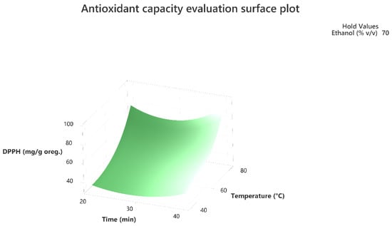 Three-dimensional response surface plot of the antioxidant capacity evaluation-DPPH assay (response variable) in mg of Trolox equivalent/g of dry matter (DM) oregano as a function of Time (X2) in min. and Temperature (X1) in Celsius degrees (°C) while holding ethanol at 70% (v/v).