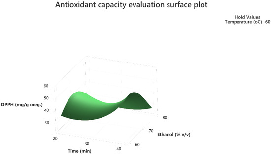 Three-dimensional response surface plot of the antioxidant capacity evaluation-DPPH assay (response variable) in mg of Trolox equivalent/g of dry matter (DM) of oregano as a function of Time (X2) in min. and Ethanol %v/v (X3) while holding temperature at 60 °C.