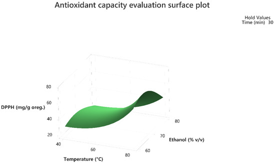 Three-dimensional response surface plot of the antioxidant capacity evaluation-DPPH assay (response variable) in mg of Trolox equivalent/g of dry matter (DM) of oregano as a function of temperature (X2) in Celsius degrees (°C) and Ethanol %v/v (X3) while holding time at 30 min.