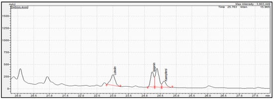 Determination of phenolic compounds performed with the validated analytical method of HPLC-PDA. Figure 7, Figure 8 and Figure 9 show the profile of the phenolic compounds under evaluation for the standard and sample solution at the 340 nm. Luteolin, apigenin, and kaempferol were quantitively determined at 1.30 ± 0.05, 1.43 ± 0.06, and 0.40 ± 0.03 mg/g dry oregano, respectively.