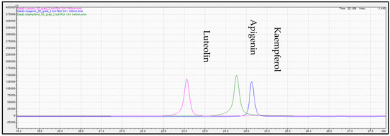 Overlay representative chromatogram acquired for standard solution of (pink color), apigenin (green color), and kaempferol (blue color) at 340 mn.