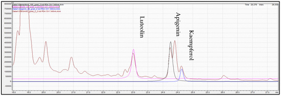 For the optimized extracts, identification and determination of apigenin, luteolin, and kaempferol were performed in oregano ultrasound assisted extract obtained with ethanol/water 60/40 (v/v) as a solvent for 40 min extraction duration and temperature was set at 80 °C.