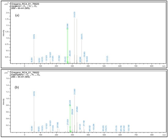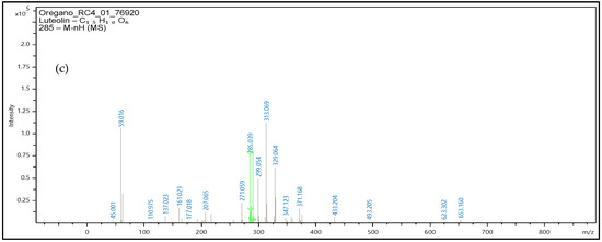 Mass spectrum of oregano extract samples at negative ionization were the precursor ion of apigenin- m/z 269 (a), kaempferol- m/z 285 (b), and luteolin- m/z 285 (c) are obtained. Green line in figure denotes the m/z value for each precursor ion.
