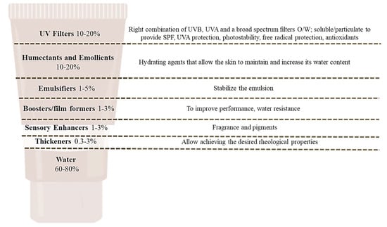 The concept of wellness and well-being has changed over the past years; it includes beauty, health, fitness and antiaging treatments. Indeed, today’s consumers express awareness regarding their skin wellness and sun protection, and studies have shown that age-prevention treatments are one of the main prioritized categories [3,4]. Photoprotection is one of the main used techniques to delay skin aging and guarantee skin well-being. This term refers to the preventative and therapeutic measures employed to protect human skin against skin cancer (photocarcinogenesis) and skin aging (photoaging) derived from UVB and UVA radiation exposure. Photoprotective measures include applying broad-spectrum sunscreens before sun exposure, wearing protective clothing and accessories such as sunglasses and hats and avoiding sun exposure [5,6]. Sunscreen is a cosmetic product capable of protecting the human skin from ultraviolet radiation due to the presence of molecules, UV filters that may be physical, chemical or both, that are capable of absorbing, dispersing or reflecting UVB and UVA radiation [7]. Sunscreen formulations can be oil-in-water (O/W) or water-in-oil (W/O) emulsions; however, consumers prefer O/W formulations because they are easy to use, dry quickly and are non-occlusive. Additionally, organic filters and inorganics may be present. Along with finding the appropriate formula, selecting products with suitable ingredients can significantly increase their effectiveness. Consumers demand an all-in-one sunscreen product that is non-toxic, non-allergic, moisturizing, antioxidant and protects against both UVA and UVB rays with a high sun protection factor (SPF) number. Figure 1 depicts the typical components of an O/W sunscreen formulation, along with their functions [8].
