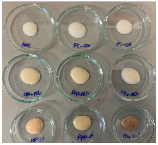 The developed sunscreen formulations include only the essential ingredients to create a cream to analyze the effect of the antioxidant capacity and SPF after adding the extracts or synthetic compounds, with the same functions. The quantities (%) of all used ingredients are in accordance with those reported in the literature and follow the legislation. To achieve the goal of this work, nine oil-in-water (O/W) formulations were produced. Synthetic antioxidant (BHT) was used as a positive control since it was necessary to develop an experiment using a synthetic AO to compare it to the formulations containing the phenolic extracts. Additionally, oxybenzone, a commonly used synthetic UV filter in sunscreens, was also selected as a positive control to use as a comparison in the study of the SPF of the formulations containing the phenolic extracts. The formulations were named NC (Negative control) for the sample without additives, PC-AOx (positive antioxidant control) for the sample containing BHT, PC-UV (positive UV filter control) for the formulation with oxybenzone, OP-AOx (onion peel extract antioxidant sample), PFP-AOx (passion fruit peel extract antioxidant sample), Mix-AOx (mixture of antioxidant control and OP and PFP extract), OP-UV (onion peel extract UV filter sample), PFP-UV (passion fruit peel extract UV filter sample) and Mix-UV (mixture of UV filter control and OP and PFP extract). The produced formulations are presented in Figure 4.