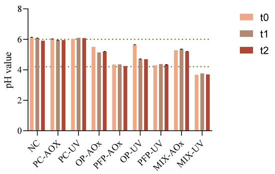 Variation in the pH value of the different formulations for the three study times: t0—week of production; t1—two weeks after production; t2—four weeks after production. NC: negative control; PC-AOx: positive antioxidant control; OP-AOx: onion peel extract antioxidant sample; PFP-AOx: passion fruit peel extract antioxidant sample; Mix-AOx: mixture of antioxidant control and OP and PFP extract; PC-UV: positive UV filter control; OP-UV: onion peel extract UV filter sample; PFP-UV: passion fruit peel extract UV filter sample; Mix-UV: mixture of UV filter control and OP and PFP extract.