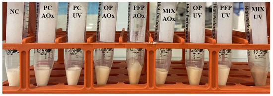 Results obtained for the centrifuge test. NC: negative control; PC-AOx: positive antioxidant control; OP-AOx: onion peel extract antioxidant sample; PFP-AOx: passion fruit peel extract antioxidant sample; Mix-AOx: mixture of antioxidant control and OP and PFP extract; PC-UV: positive UV filter control; OP-UV: onion peel extract UV filter sample; PFP-UV: passion fruit peel extract UV filter sample; Mix-UV: mixture of UV filter control and OP and PFP extract.