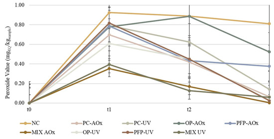 Variation in the peroxide value throughout the study period for the produced formulations. The analysis was performed for three study times: t0—week of production; t1—two weeks after production; t2—four weeks after production. NC: negative control; PC-AOx: positive antioxidant control; OP-AOx: onion peel extract antioxidant sample; PFP-AOx: passion fruit peel extract antioxidant sample; Mix-AOx: mixture of antioxidant control and OP and PFP extract; PC-UV: positive UV filter control; OP-UV: onion peel extract UV filter sample; PFP-UV: passion fruit peel extract UV filter sample; Mix-UV: mixture of UV filter control and OP and PFP extract.