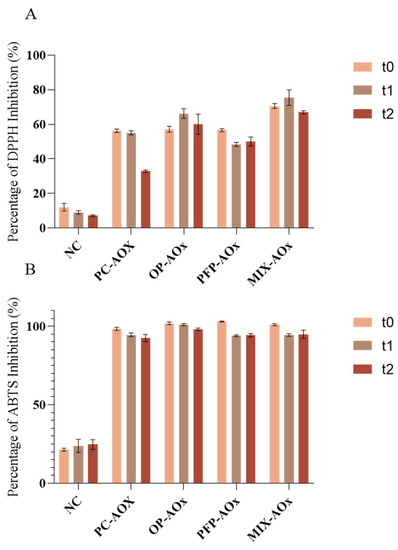Results were obtained for (A) assay with DPPH radical and (B) assay with ABTS radical. The analysis was performed for three study times: t0—week of production; t1—two weeks after production; t2—four weeks after production. NC: negative control; PC-AOx: positive antioxidant control; OP-AOx: onion peel extract antioxidant sample; PFP-AOx: passion fruit peel extract antioxidant sample; Mix-AOx: mixture of antioxidant control and OP and PFP extract.
