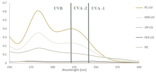 In order to determine the efficacy of the prepared sunscreen emulsions, regarding UV radiation protection properties, the sun protection factor (SPF) was determined. It is noteworthy that for this assay only formulations NC, PC-UV, OP-UV, PFP-UV and Mix-UV were analyzed since they were the ones to which UV filters were added. To calculate the SPF values, the absorbance values at specific wavelengths were required; the absorption spectra of these formulations are shown in Figure 9. The SPF values were determined using Equation (3) presented in Section 3.2.9. The obtained values are listed in Table 5.