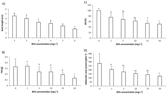 Parameters of root growth and level of plant hormone gibberellic acid (GA3) in the root of Allium cepa after 3 days exposure to bisphenol A (BPA) in concentration range (1–50 mg L–1): (A) root length, (B) root fresh weight (FW), (C) mitotic index (MI) of root meristem cells, and (D) the level of GA3 in root cells. Data are presented as mean ± SD (n = 5 replicates; MI was calculated on total of 2500 cells per treatment (of 5 replicates) and expressed as %, control is set to 100%). Different letters indicate significant difference (p ≤ 0.05). 0—control plants, not exposed to BPA.