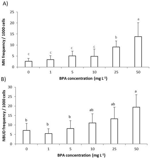 The genotoxic effect of BPA to roots’ meristem cells of A. cepa exposed to BPA (1–50 mg L−1) was estimated by assessing the frequency of MNs and NBUDs of interphasic nuclei in roots’ meristem cells (Figure 2A,B).