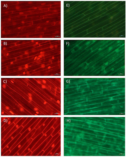 Level of reactive oxygen species (ROS) in situ in root cells of Allium cepa exposed to bisphenol A (BPA) in concentration range 1–10 mg L−1 for 3 days. Representative fluorescence images of level of: (A–D) superoxide radical (O2−) and (E–H) hydrogen peroxide (H2O2) in root cells. (A,E) control; (B,F) exposure to 1 mg L−1; (C,G) 5 mg L−1; and (D,H) 10 mg L−1 of BPA. Scale bar: 20 μm.