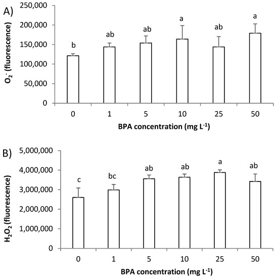 Level of reactive oxygen species (ROS) in root cells of Allium cepa exposed to bisphenol A (BPA) in concentration range 1–50 mg L−1 for 3 days. Level of: (A) superoxide radical (O2−) and (B) hydrogen peroxide (H2O2). Results are presented as means ± SD (n = 5 replicates). Different letters indicate significant difference (p ≤ 0.05). 0—control plants, not exposed to BPA.