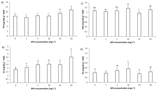 The level of phytochemicals in roots cells of Allium cepa exposed to bisphenol A (BPA) (1–50 mg L−1) for 3 days. (A) level of total polyphenols (TP), (B) level of total flavonoids (TF), (C) level of hydroxycinnamic acids (THA), and (D) level of total flavonols (TFL) Results are presented as means ± SD (n = 5 replicates). Different letters indicate significant difference (p ≤ 0.05). 0—control plants, not exposed to BPA.