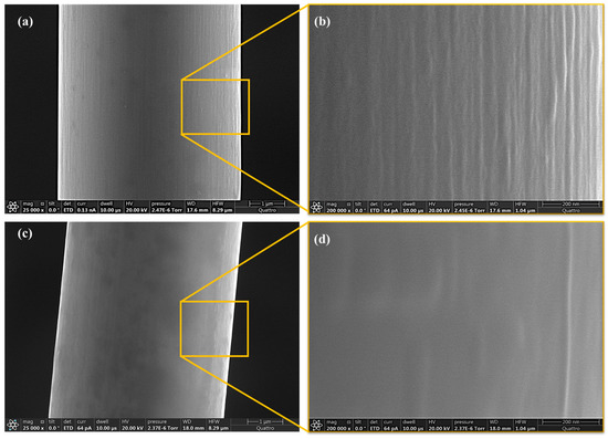 SEM images of the surface of the fiber (a,b) IM carbon fiber MR70, (c,d) HM carbon fiber HS40.